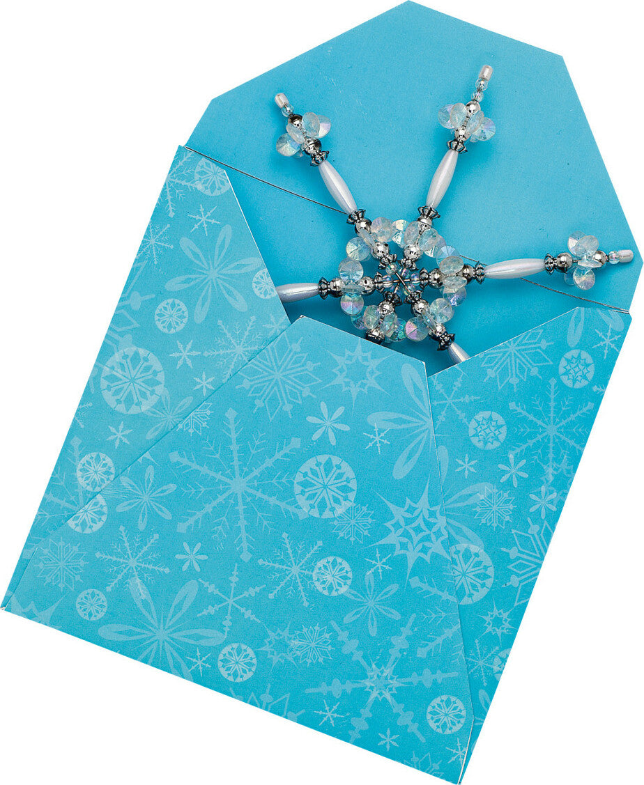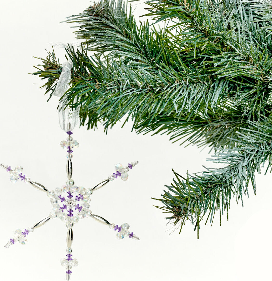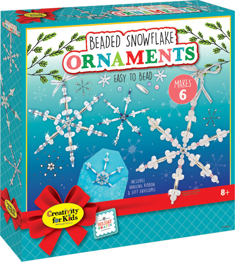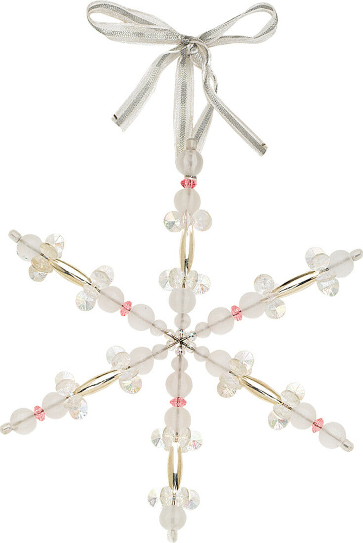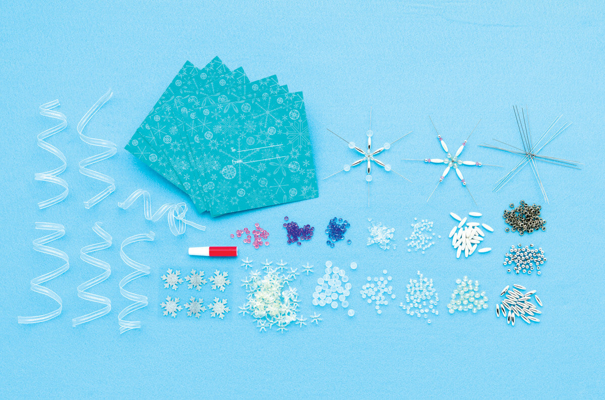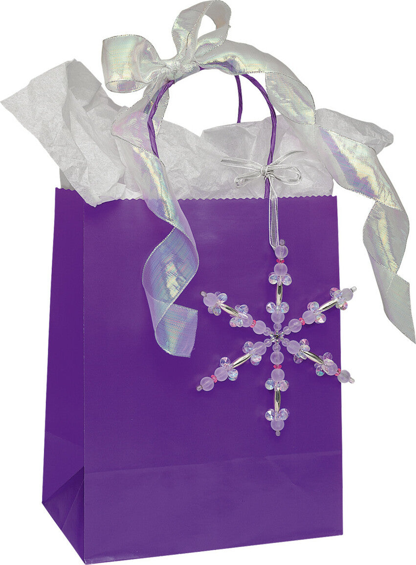 Turn this simple craft into 6 beautiful beaded snowflakes. Perfect for decorating your tree or use them to adorn packages. Hanging ribbon and gift wrappers are included. Completed snowflakes measure 5.5 inches. When the holidays are over, hang your snowflakes in a sunny window.