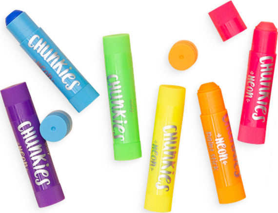 When you want to paint colorful pictures but want to leave the mess behind then it's time to reach for Chunkies Paint Sticks. These neon paint sticks are super easy to use, clean and portable because they're like painting with a crayon. Just uncap, twist and start painting. Chunkies neon are a set of 6 brilliantly colored paint sticks each in a thick barreled casing so they're easy for little hands to hold. The paint colors are quick drying and won't smudge, but it's easy to mix colors to make even more colors. It's magic!