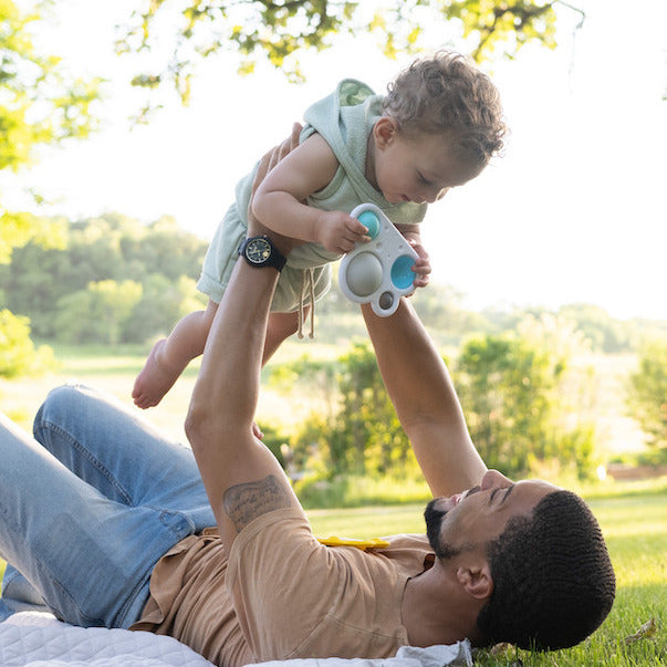 - Encourages sensory exploration, fine motor skills, cause-effect learning