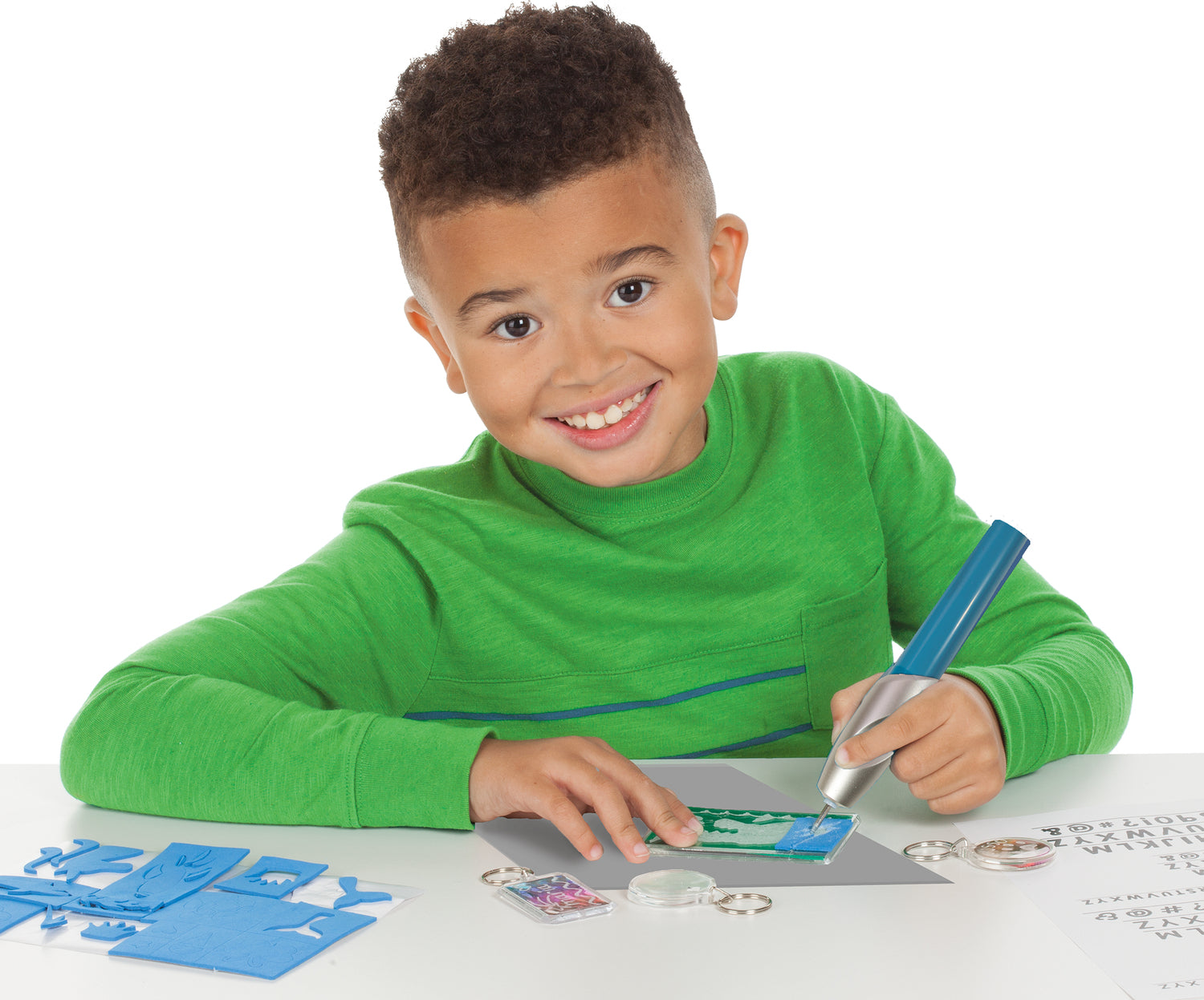 Personalize 7 unique accessories with this child-safe etching tool. The rotating tip gently etches the surface, creating amazing designs.