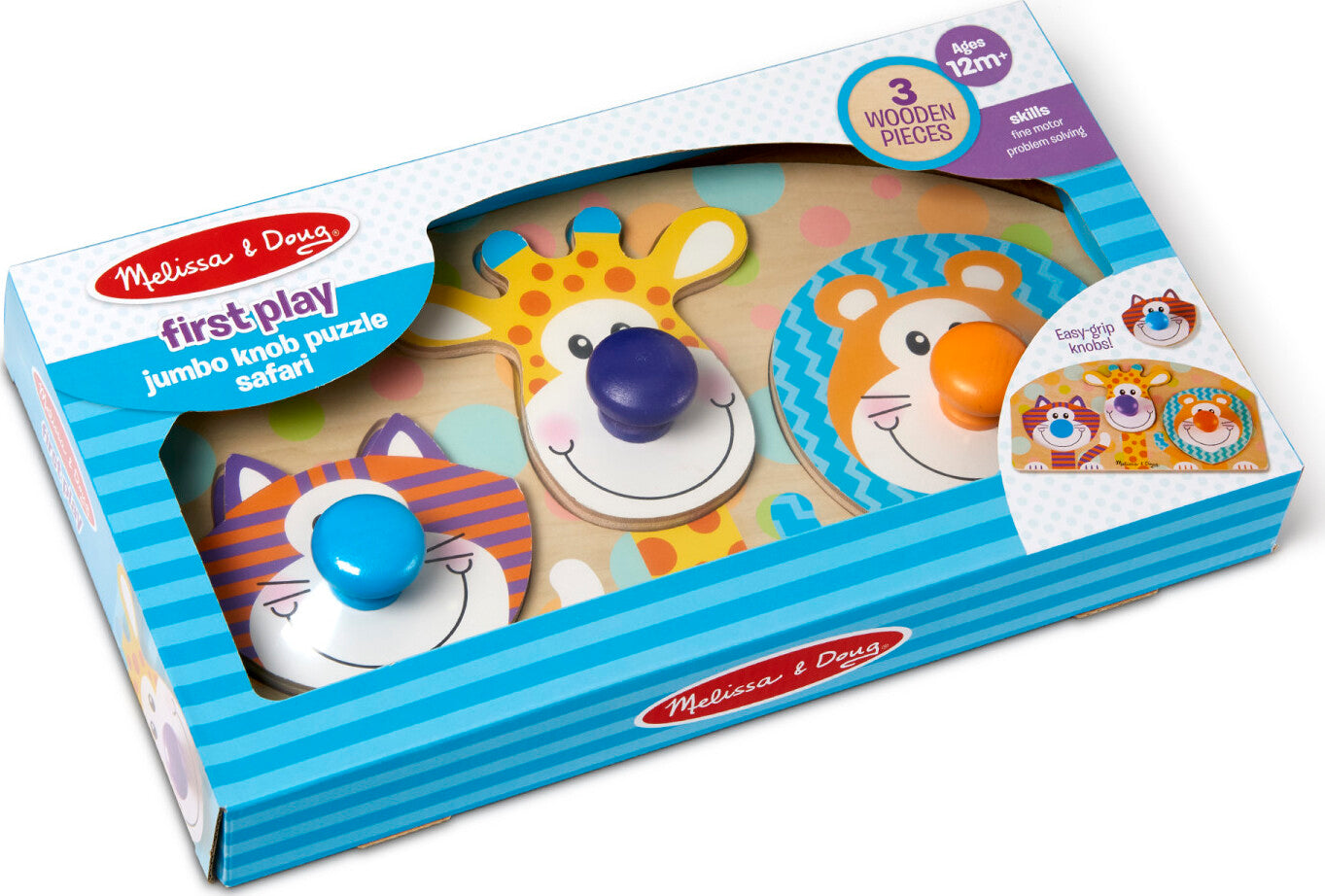 Little hands and big imaginations will love these friendly wooden safari animals with oversized noses! The smiling tiger, giraffe, and lion have wooden knobs for noses that are easy to grasp. Babies and toddlers will delight in matching pieces to pictures on the sturdy wooden 14-inch by eight-inch puzzle board, discovering colors and patterns, and developing fine motor skills. First Play puzzles and toys feature bright colors, bold patterns, and whimsical designs that boost skills while sparking imagination and wonder—right from the start!