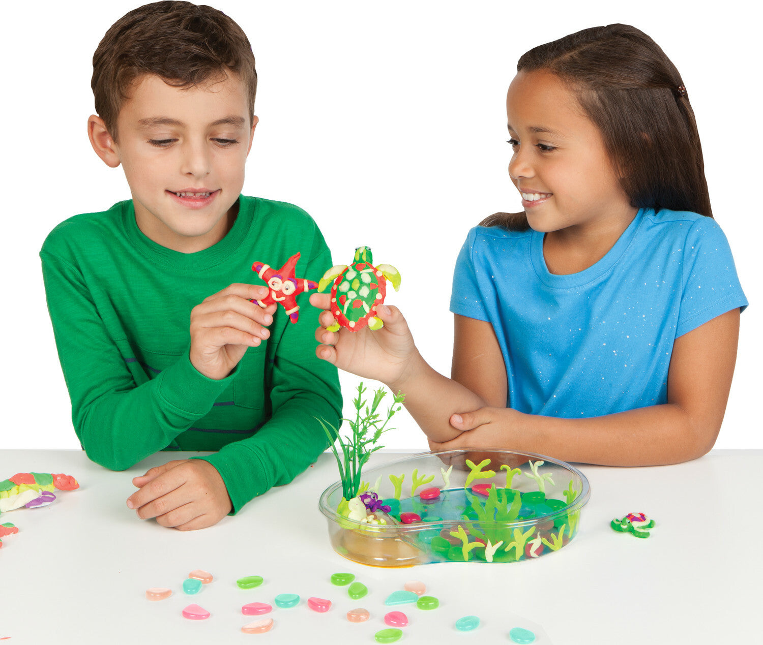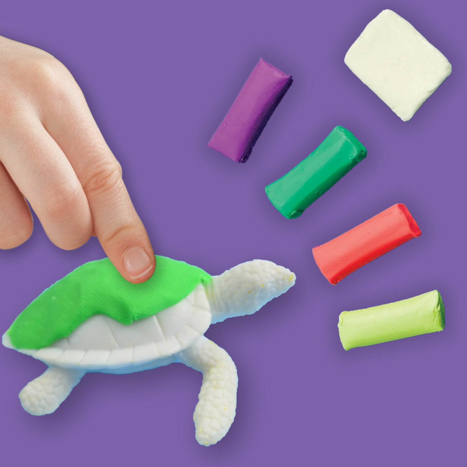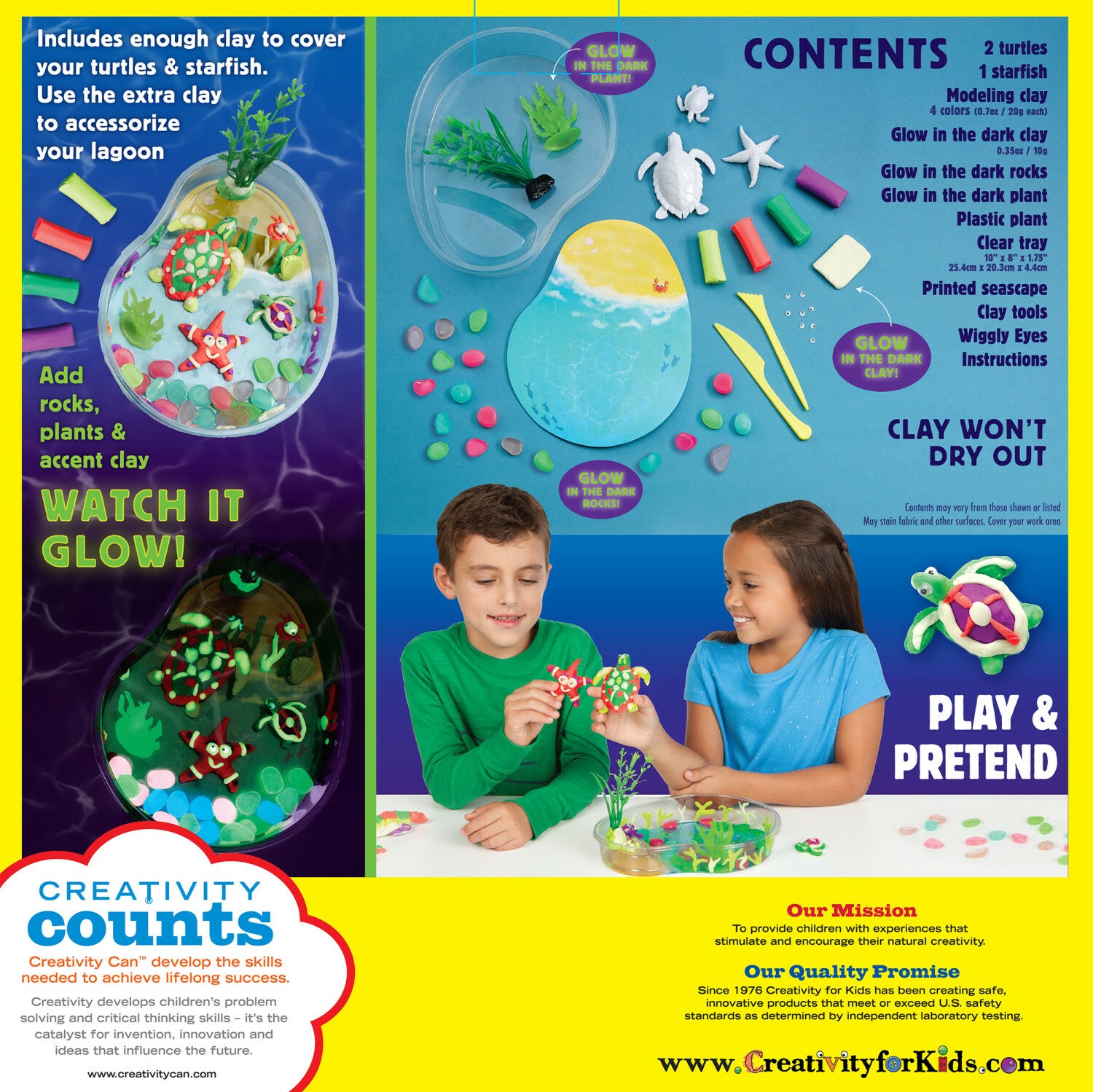 Cover 2 turtles and a starfish with clay. Also includes glow-in-the-dark clay, rocks and plants, plus a printed seascape to design the lagoon. Finished habitat measures 10" l x 8" w x 1 .75"h.