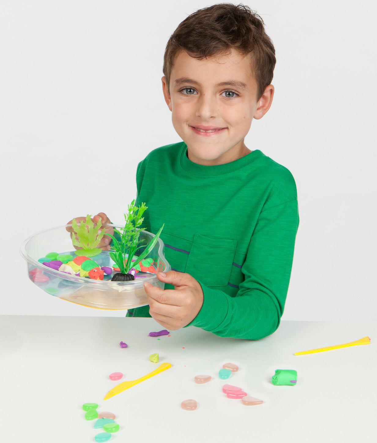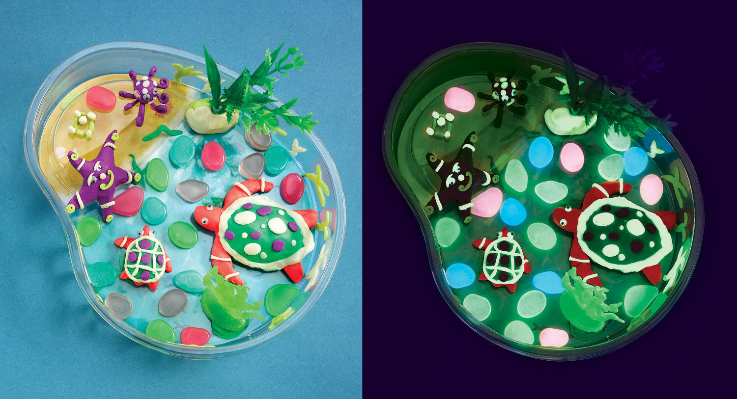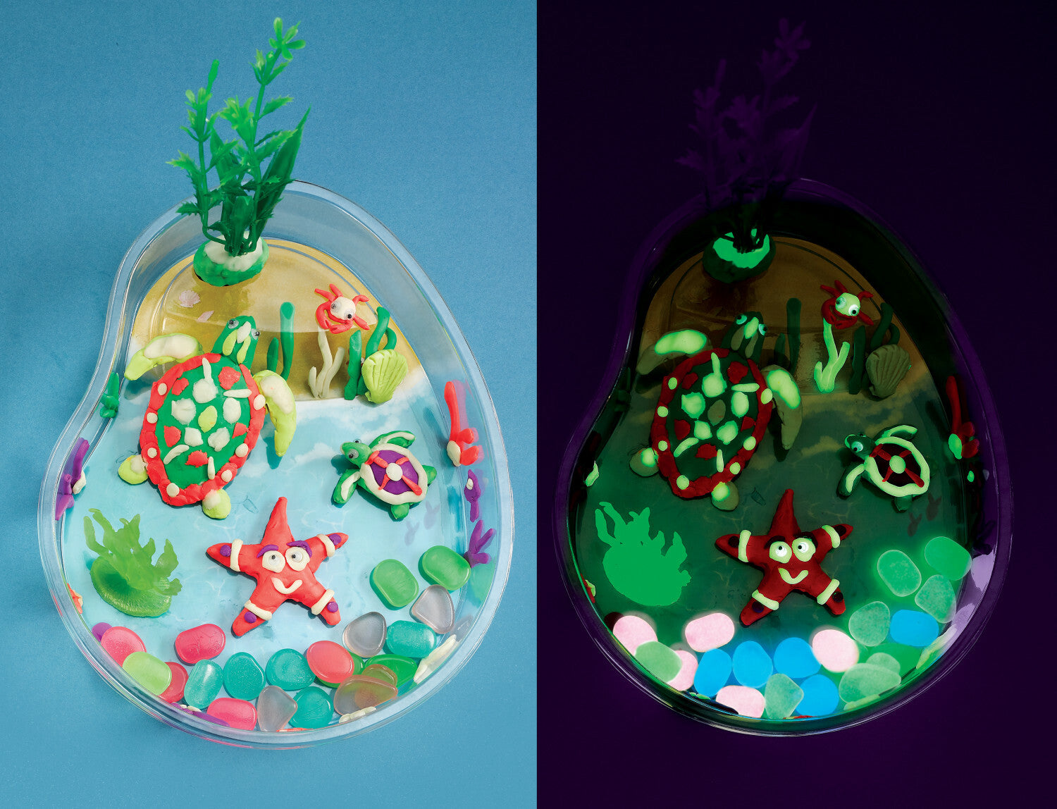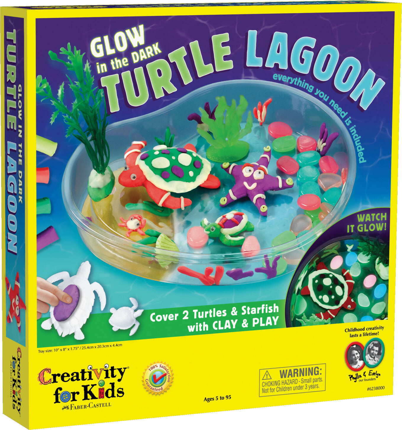 Cover 2 turtles and a starfish with clay. Also includes glow-in-the-dark clay, rocks and plants, plus a printed seascape to design the lagoon. Finished habitat measures 10" l x 8" w x 1 .75"h.