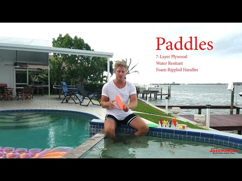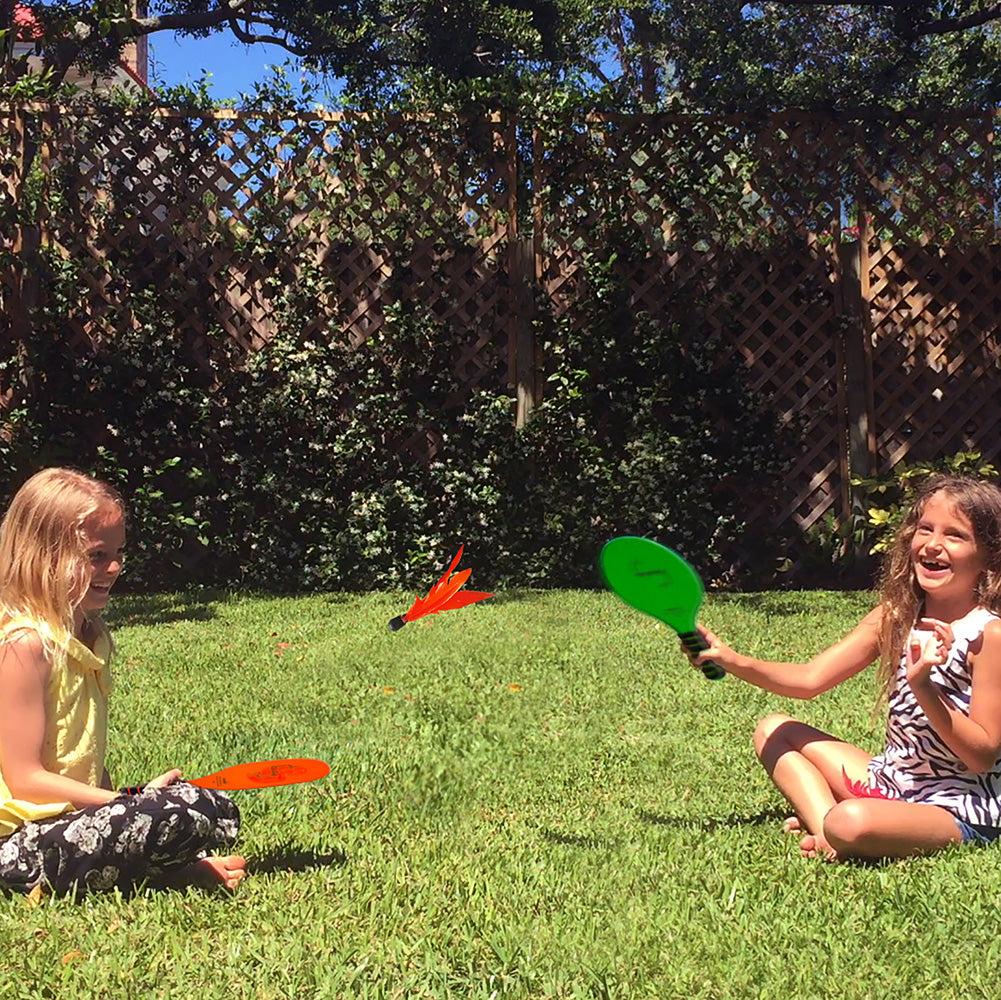 Indoors or out, this game will get everyone up and moving, away from the TV, phone and video game screens. Competitive or casual play are both fun and challenging; choose your birdie for slow, fast, or LED-lit evening play. Friendly for beginners and experts, it's beautifully designed, and the largest paddleball set on the market. Set includes 2 fluorescent wood paddles with soft foam grips, 2 balls, 1 fast-play and 2 slow-play shuttlecocks, 2 LED nighttime birdies, 1 wind birdie and a durable carrying bag that holds it all. Play over a net (not included) or even at the beach, because they float, too! 2 cell batteries included.