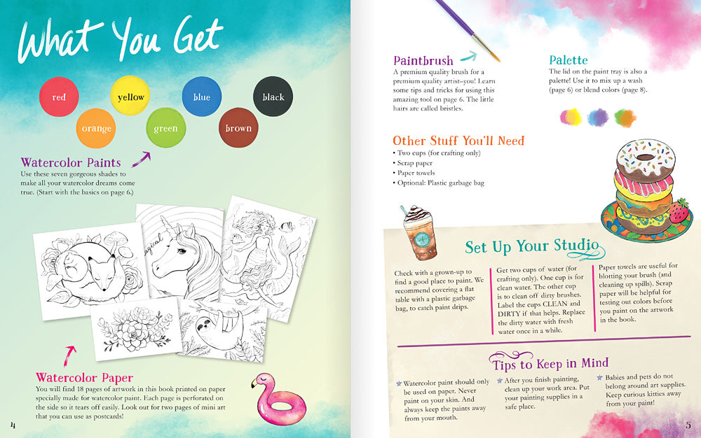 This oversized, spiral bound pad is full of lively and detailed painting tips, tricks, and techniques, letting you bring 18 gorgeous black-and-white illustrations to life. Seven premium paints, a high-quality brush, and color-mixing tray let you make beautiful art.