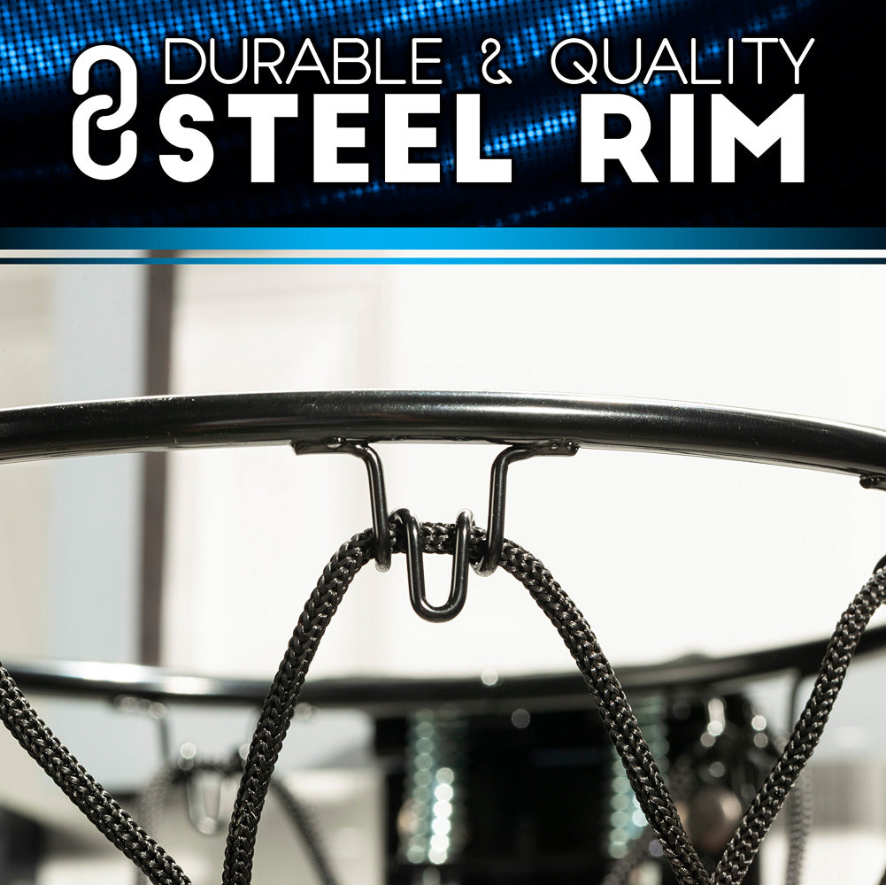 Practice your basket-shooting skills when going outside isn't an option. Just hang the backboard over the door, flip on the cool LED lights, and take your first free throw! At 18" x 12", it installs easily on almost all standard doors, plus it's designed with built-in cushioning to protect your doors from damage. Includes a 5" rubber basketball with an easy-grip, textured surface, plus a pump. Requires 3 AAA batteries.