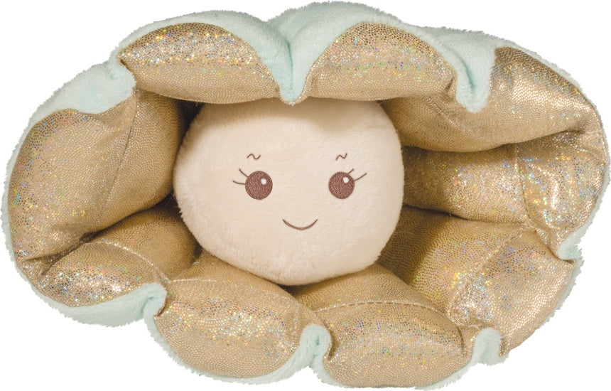 Moondrop is a playful little pearl who lives in a magical plush Oyster shell at the bottom of the ocean! Give her a snuggle, DOUGLAS guarantee this whimsical Oyster stuffed animal is soft and adorable as can be! Velvety plush fabric in a pastel aqua color can be found on the exterior of her shell while shimmery iridescent material lines the inside giving it a magical sparkle. Hiding within, a soft and squeezable pearl looks out with a charming embroidered expression. The wonders of the deep blue sea have never been so fanciful. Bring home Moondrop the Pearl in her snug little Oyster shell and let this cuddly soft toy enchant and delight!