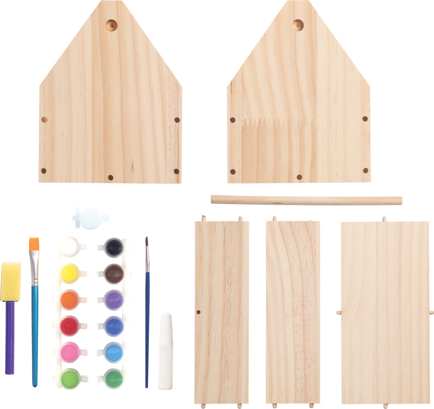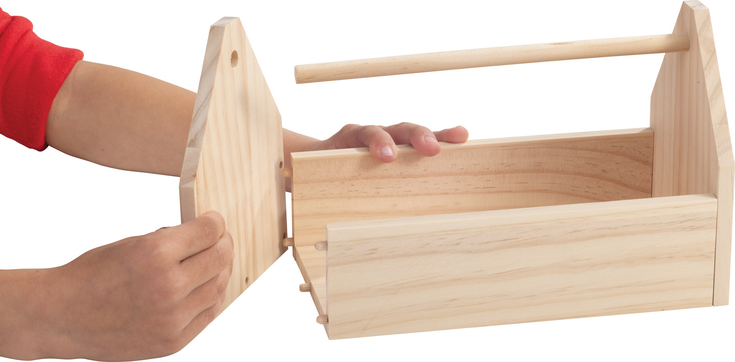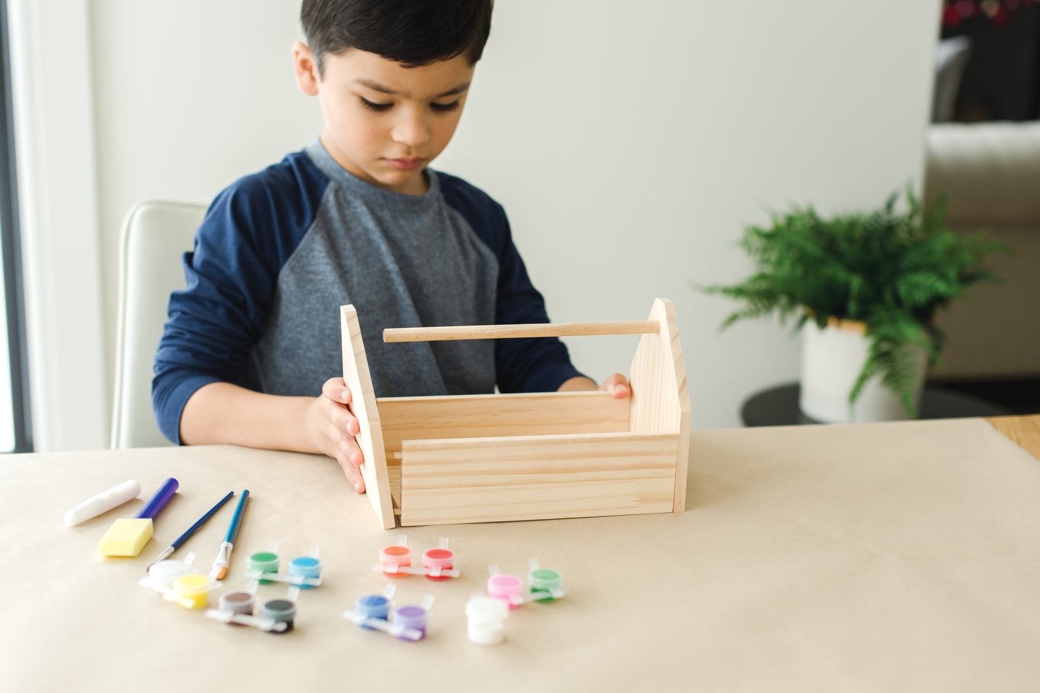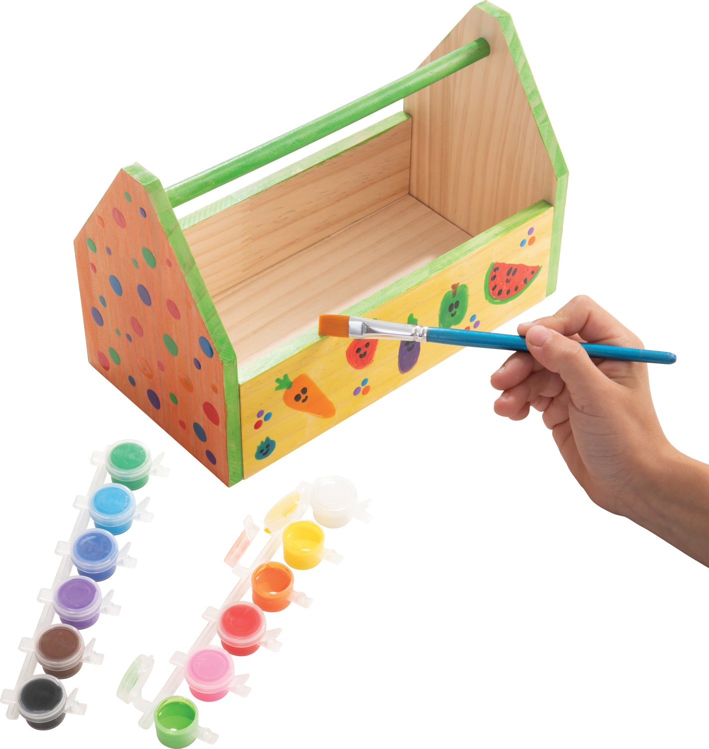 Includes 6 wood tool box pieces, craft glue, 13 paint colors, 3 paintbrushes and instructions.