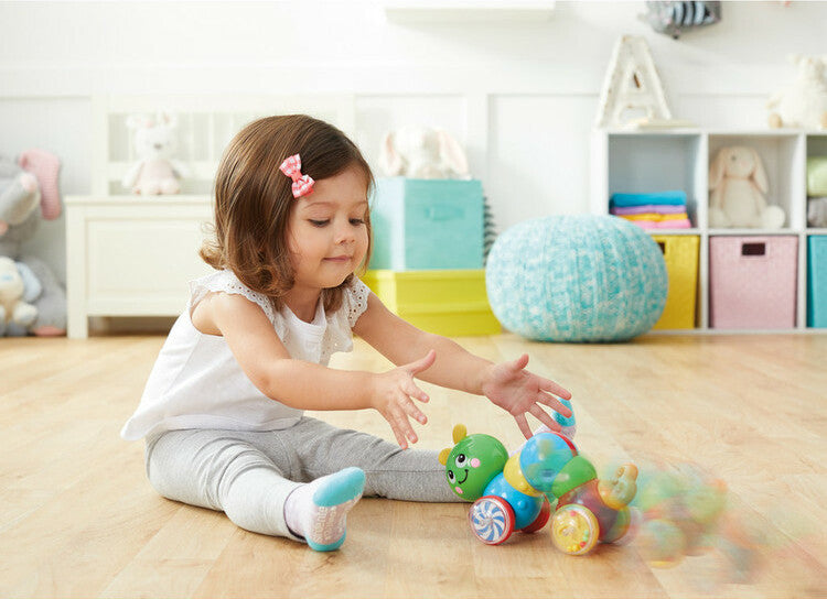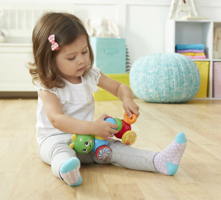 Press-N-Go Inchworm is sure to keep your little ones excited about getting active. This toy features bright colors and moving beads in the wheels to attract kid’s attention. Press down on the inchworm’s back and watch it zoom across the floor! Studies show that introducing children to beneficial skills early on in development leads to more attuned mental faculties. Our Press-N-Go Inchworm engages and enhances children's fine motor and problem solving skills, and also teaches them cause and effect learning. This toy is ideal for broadening mental faculties through creative and active play in young children, ideally toddlers and preschoolers. This classic safe toy encourages walking and crawling. Like all Kidoozie products, the Press-N-Go Inchworm was built using only safe and top-quality materials that will last for years to come.