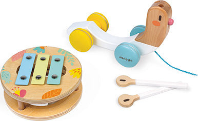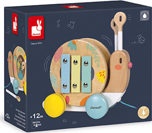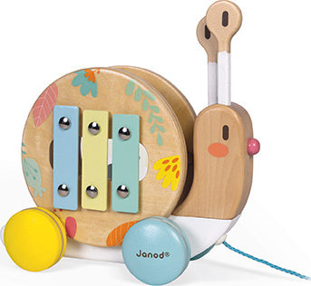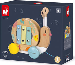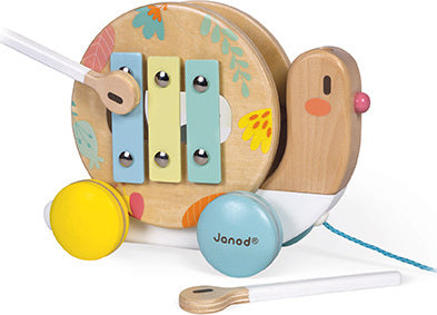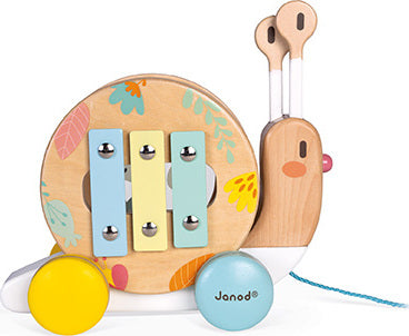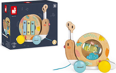 A fun snail to take for a walk, featuring very soft, contemporary shades. The shell turns as you walk the snail, and may be removed to reveal a tambourine and a small xylophone! The snail's antennae may also be removed to become sticks. A fun way to awaken your child's interest in music! Waterbased painting. Wood : beechwood and plywood.