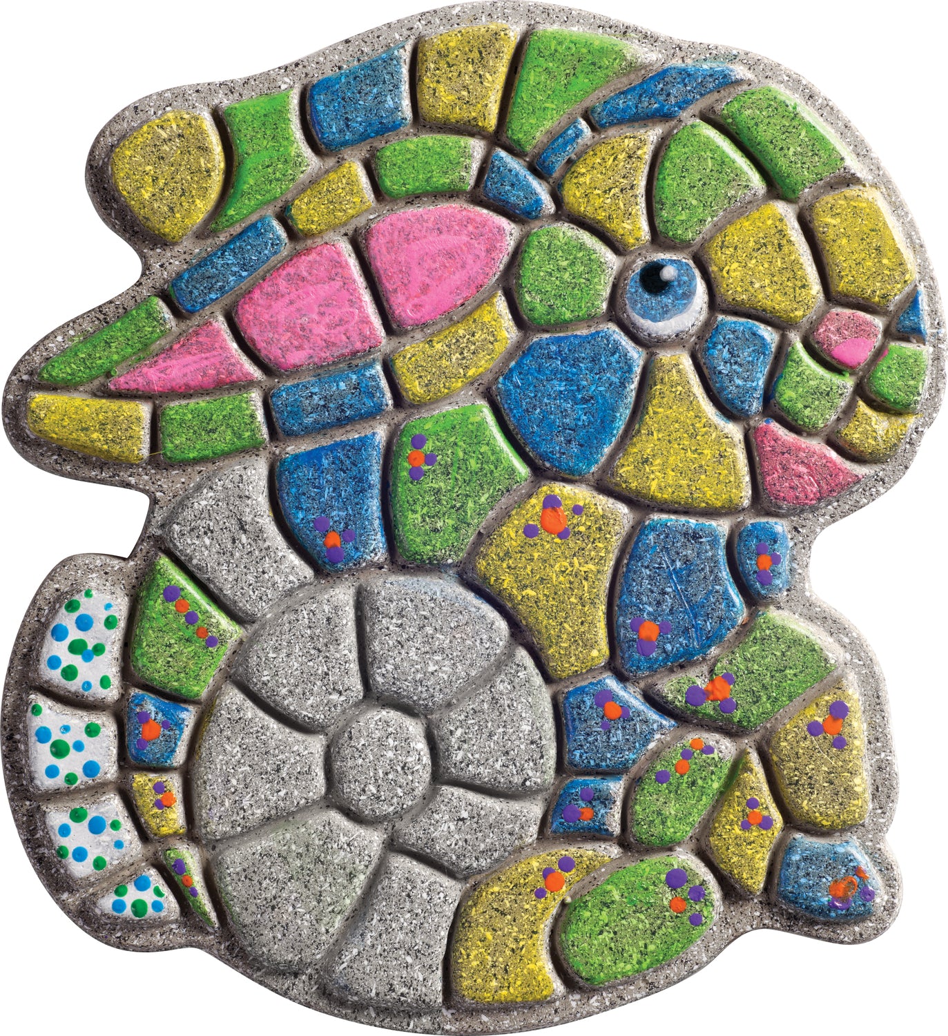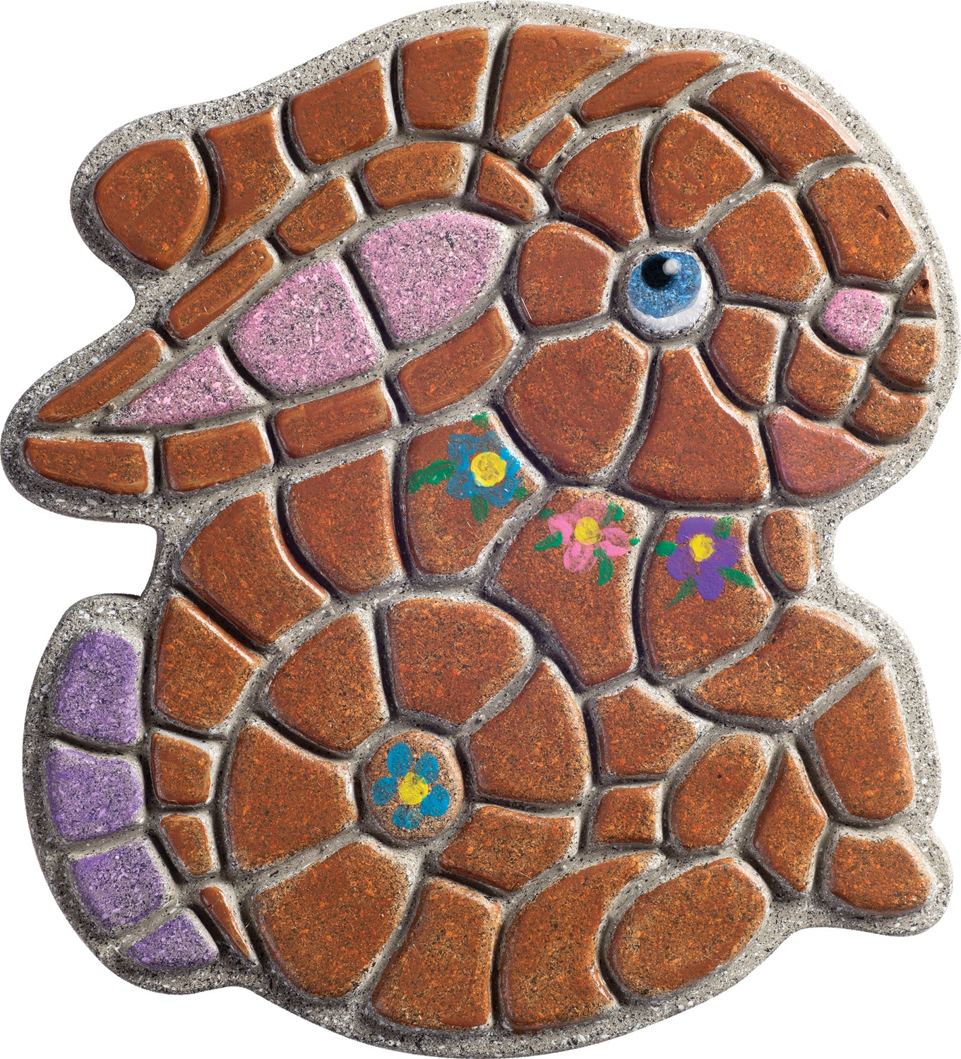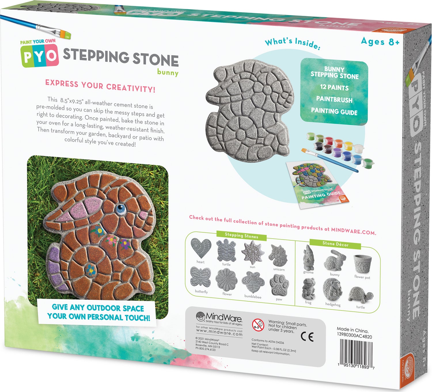 Kit contains 8.5” x 9.25” cement stepping stone, 12 paints, a paint brush and painting guide.