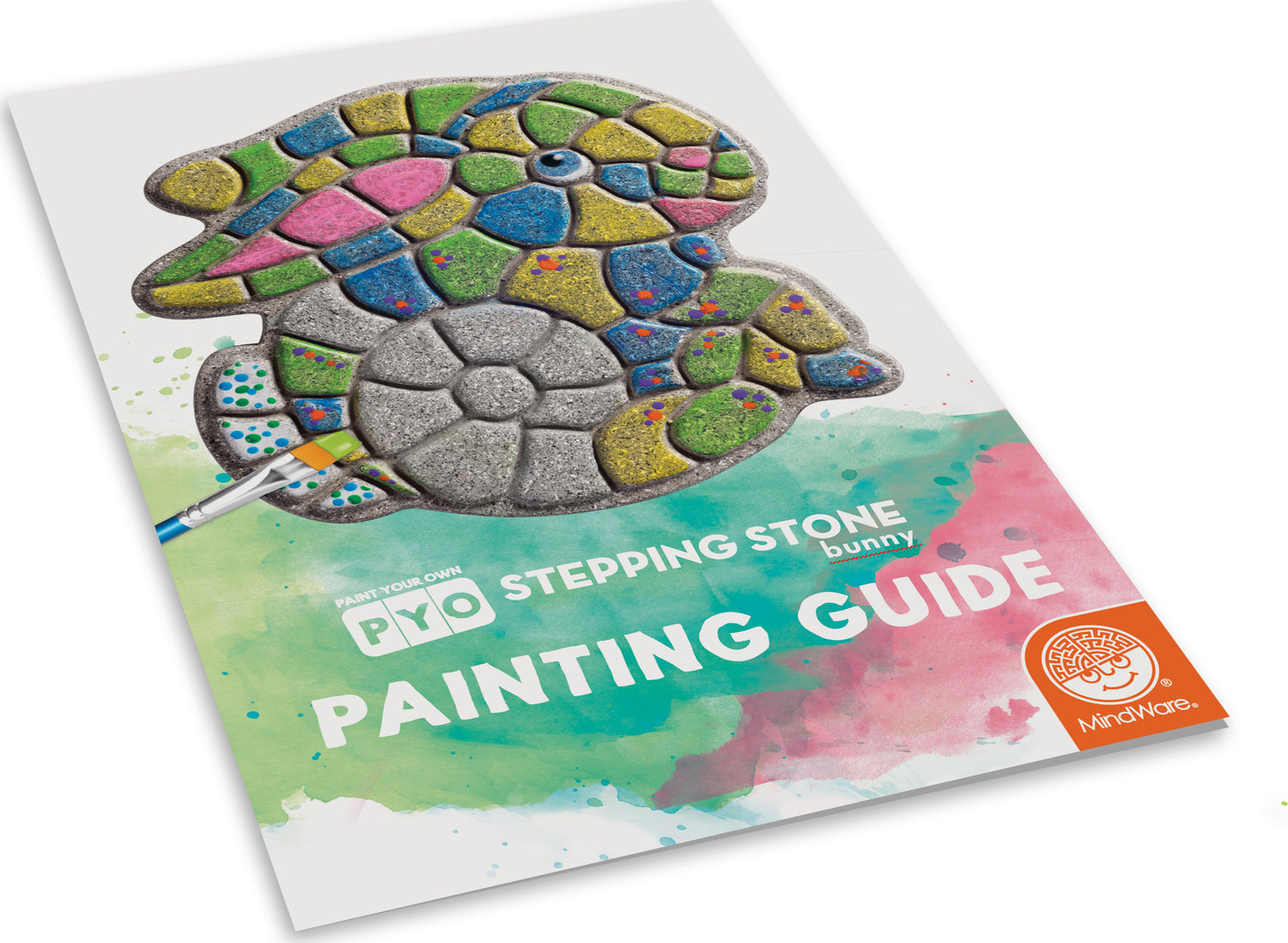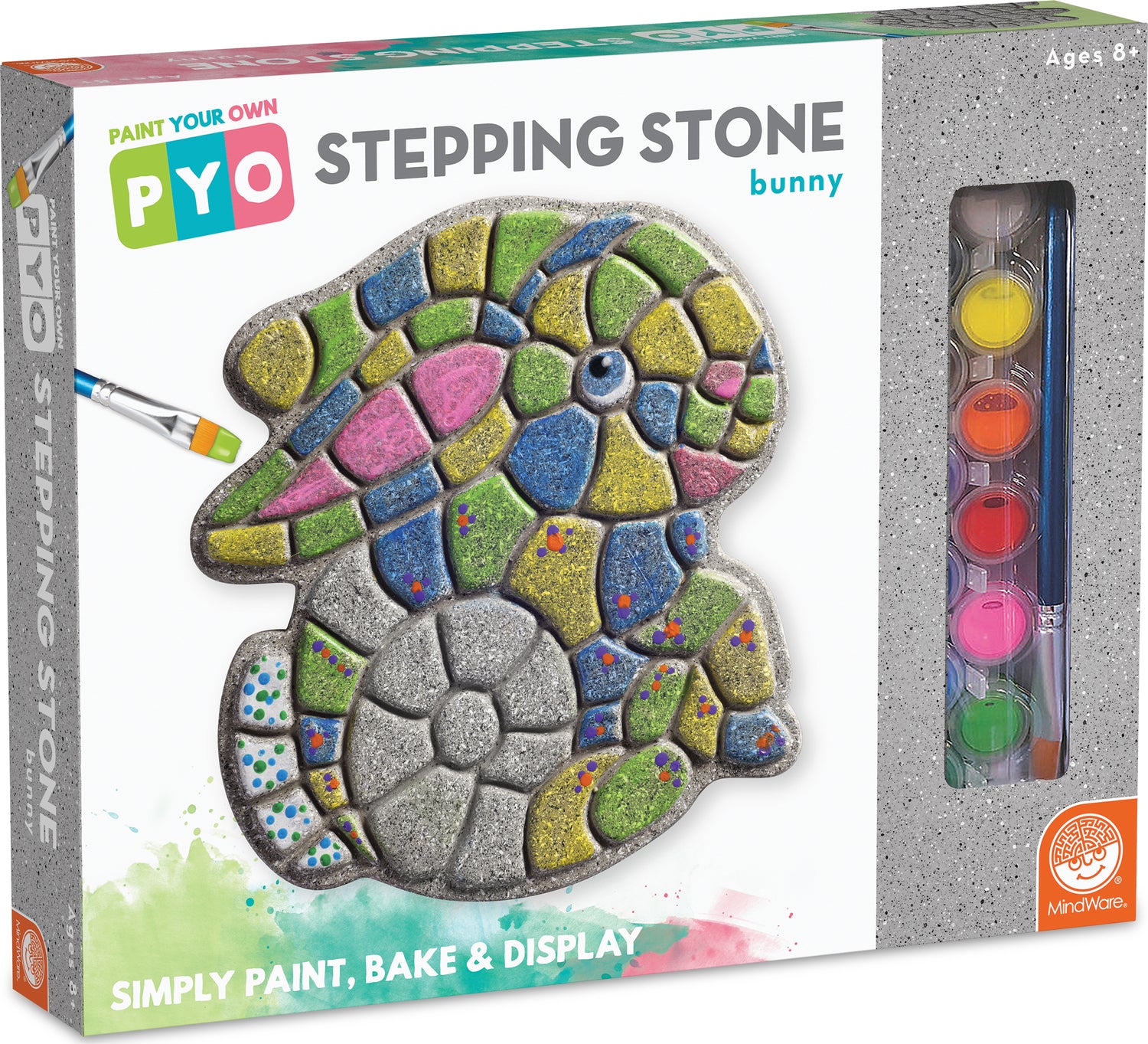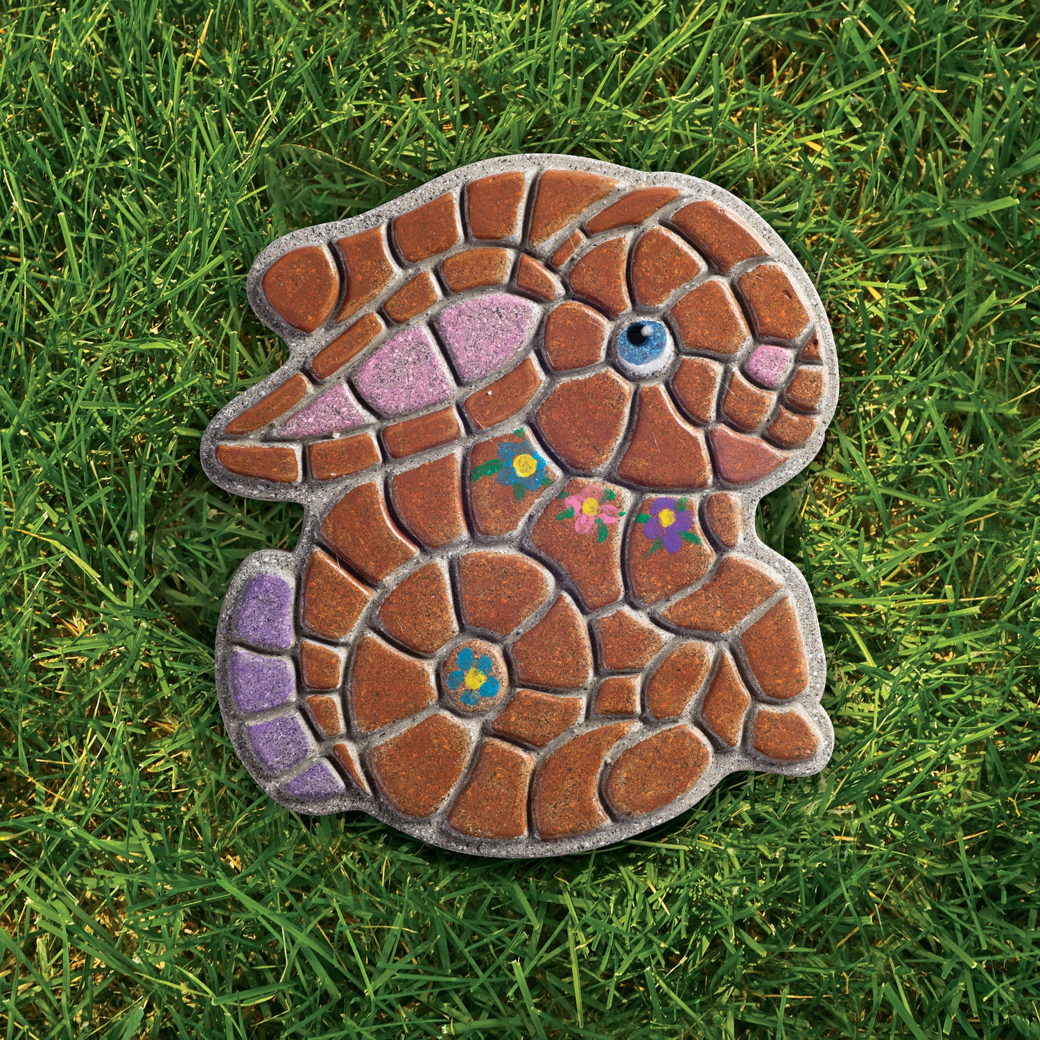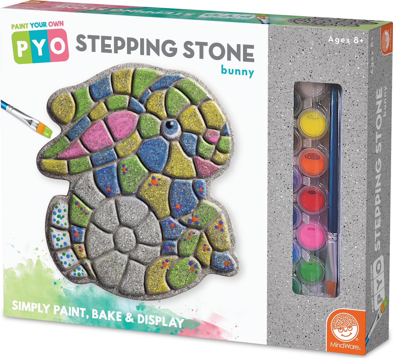 Kit contains 8.5” x 9.25” cement stepping stone, 12 paints, a paint brush and painting guide.