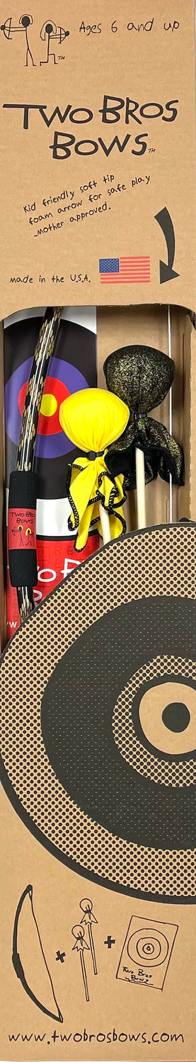 Two Bros Bows Python Bow and Arrow Packaged Box Set. Made in the USA & 3rd party tested. Two Bros Bows were created by kid inventors Duncan and Hayden when they were 10 & 7. Encourages active play, outdoor play, dexterity, hand-eye coordination.