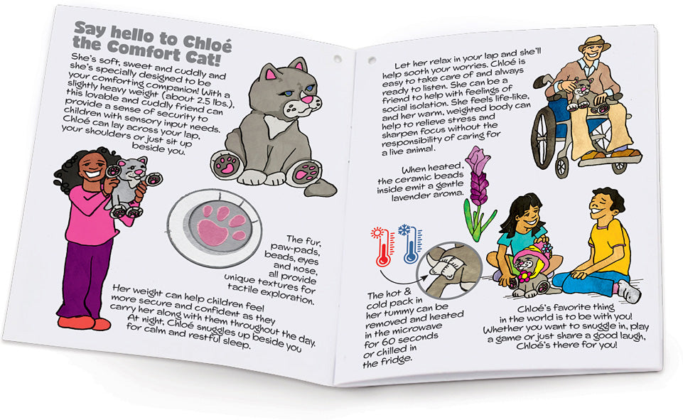 Need a hug? Snuggle into this weighted, textured companion, designed to melt anxiety and stress. Chloe is 2.5 lbs and has a lavender scented hot/cold tummy. Her paws, fur, ear and eyes are designed for tactile exploration. This adorable therapeutic companion can provide comfort for adults and kids with sensory input needs.
