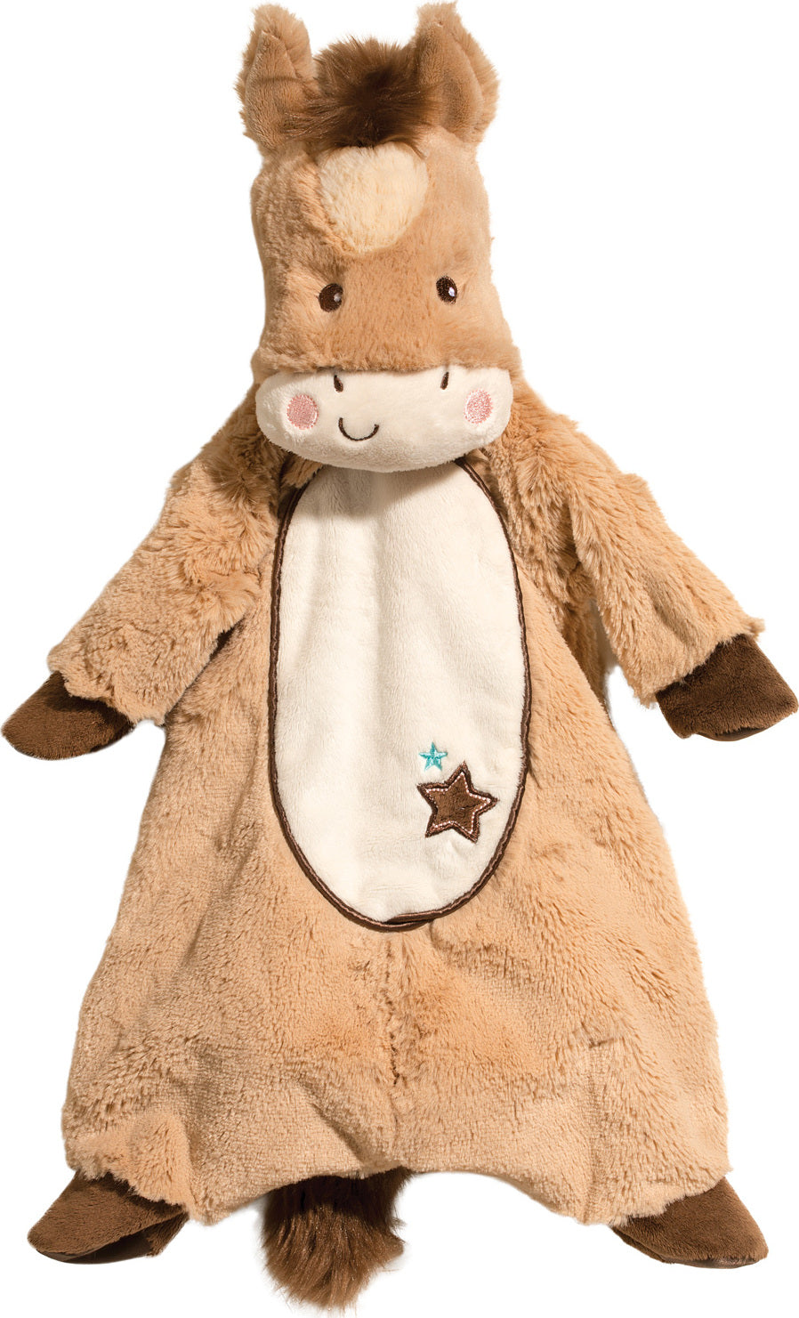 Douglas' Lil' Star Pony Sshlumpie soft toy is designed with versatility in mind. Lay him out flat to make a play mat for Baby or tuck him in for hugs and cuddles when it's time for a nap or car ride. This machine washable Sshlumpie is both a blanket and a plush toy! Our playful pony is crafted with luxuriously soft materials in warm tan and brown tones. He features endearing embroidered details on his face and belly. Fluffy tufts of fur accent his mane and tail. Shop our entire Lil' Star Pony collection to assemble your very own custom set of Baby Pony accessories.