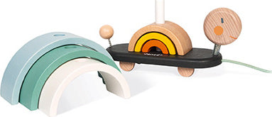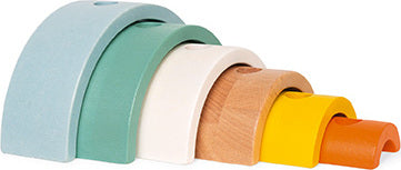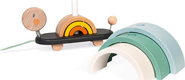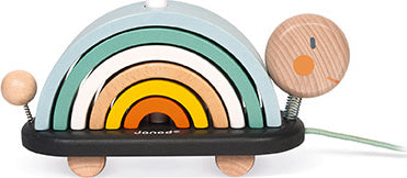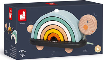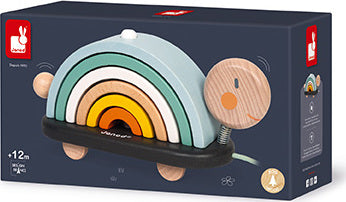 A lovely turtle to take for walks, featuring a rainbow shell comprised of 6 wooden circular arches. The rainbows may be freely stacked to become an original construction game. A range featuring delicate colours and rounded lines, inspired by current trends to gently support your child's first steps in learning! Waterbased painting. Wood : beechwood and chinese cherry. Closed colour box
