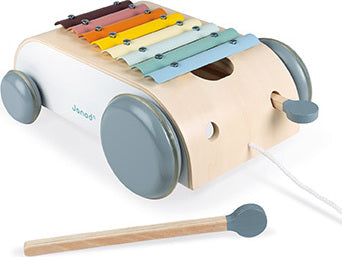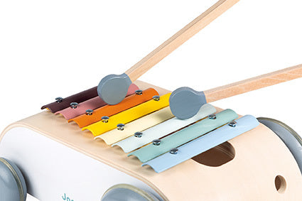 2-in-1 toy: Xylophone for budding young musicians and pull toy for bringing  everywhere from the time of Baby's first steps. A range featuring delicate  colours and rounded lines, inspired by current trends to gently support  your child's first steps in learning! Waterbased painting. Wood : plywood  and chinese cherry. Metal keys. Closed colour box.