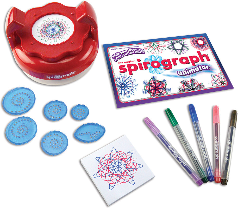 A childhood classic gets a new 3D spin with cool LED lights! The animator has a spinner platform that makes every design move in a different way with each of the rotating light effects. Additional features include a built-in storage compartment underneath and an easy-on/off button. You'll also get 6 wheels, 5 fine-line pens, a 100-sheet pad and of course an instruction guide, so start swirling! Compatible with other Spirograph sets. Requires 3 AAA batteries, not included.