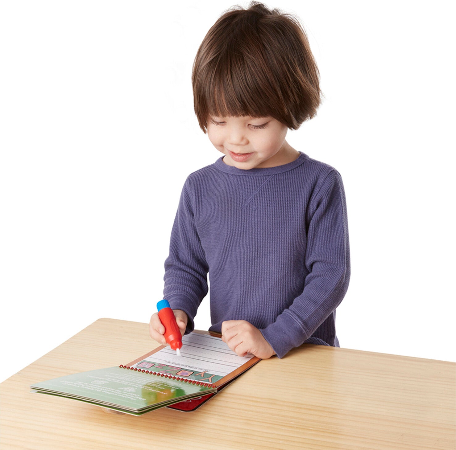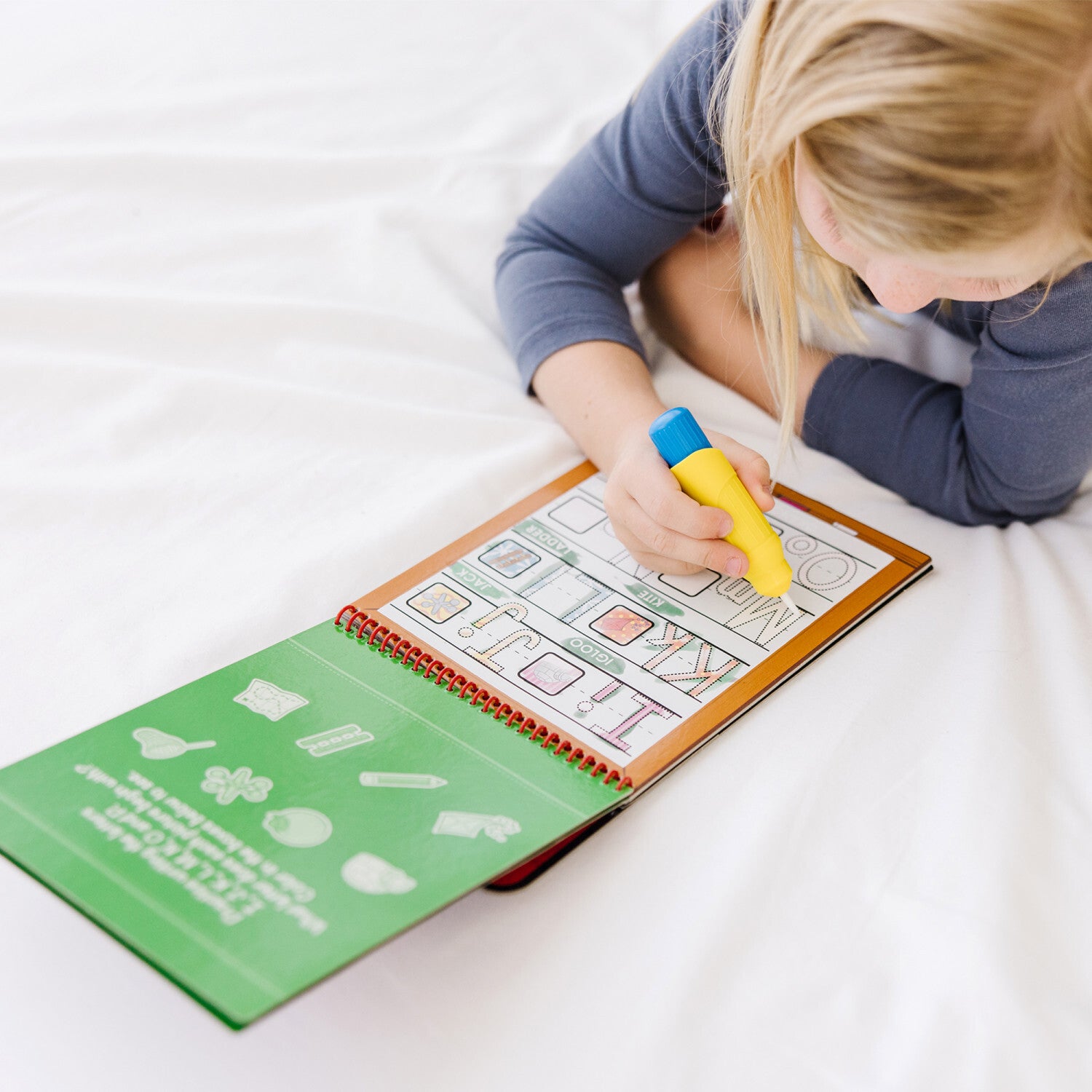 This exciting activity book includes four reusable pages and a refillable water pen. Use the pen to fill in each activity, from coloring in boxes to tracing letters, and see hidden colors and pictures appear with every stroke! Then simply let the page dry to erase the pictures and fill it in again and again. This alphabet-themed book includes every letter of the alphabet (uppercase and lowercase) to trace, alongside pictures of familiar objects to illustrate each sound. There are empty lines for practice, too! The chunky-sized water pen is easy for kids to hold and stores neatly right in the front cover.