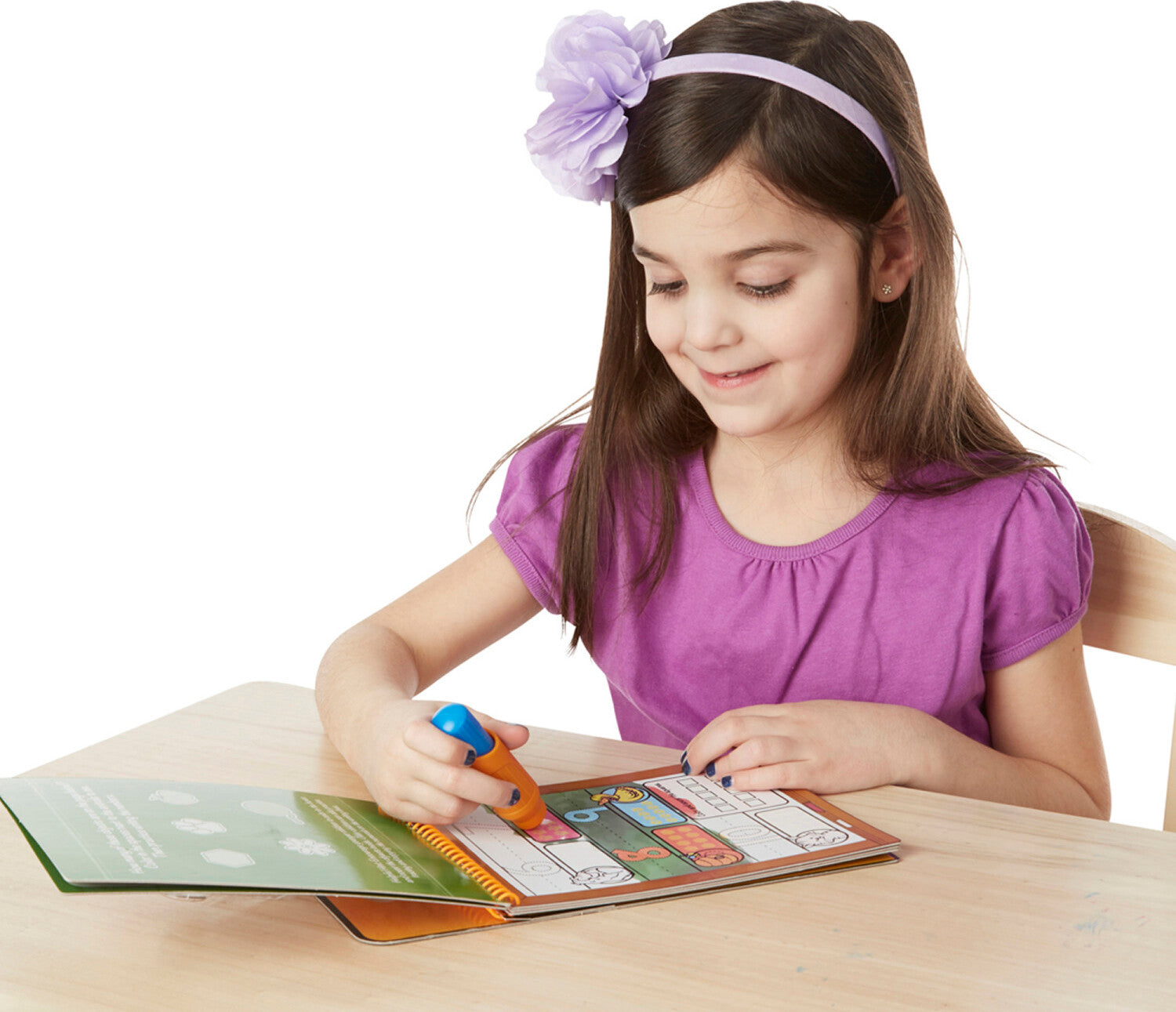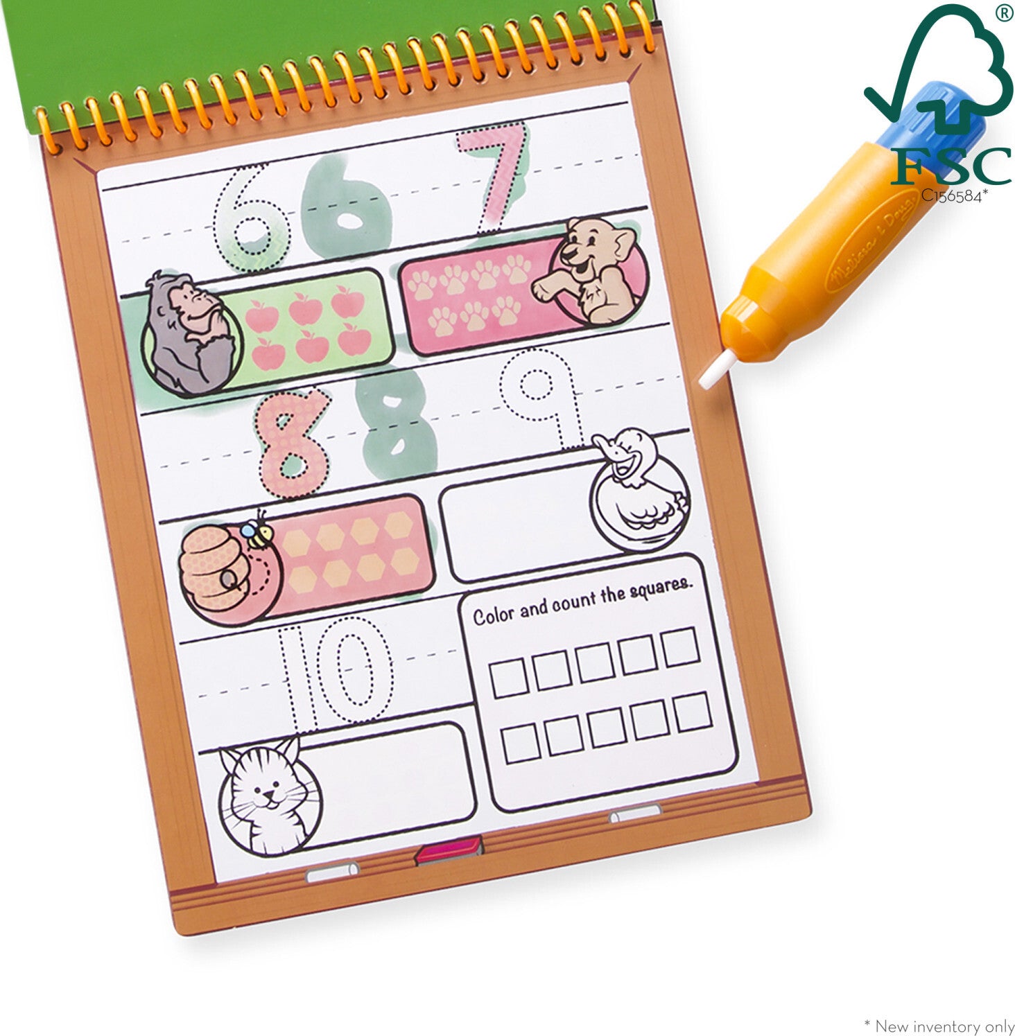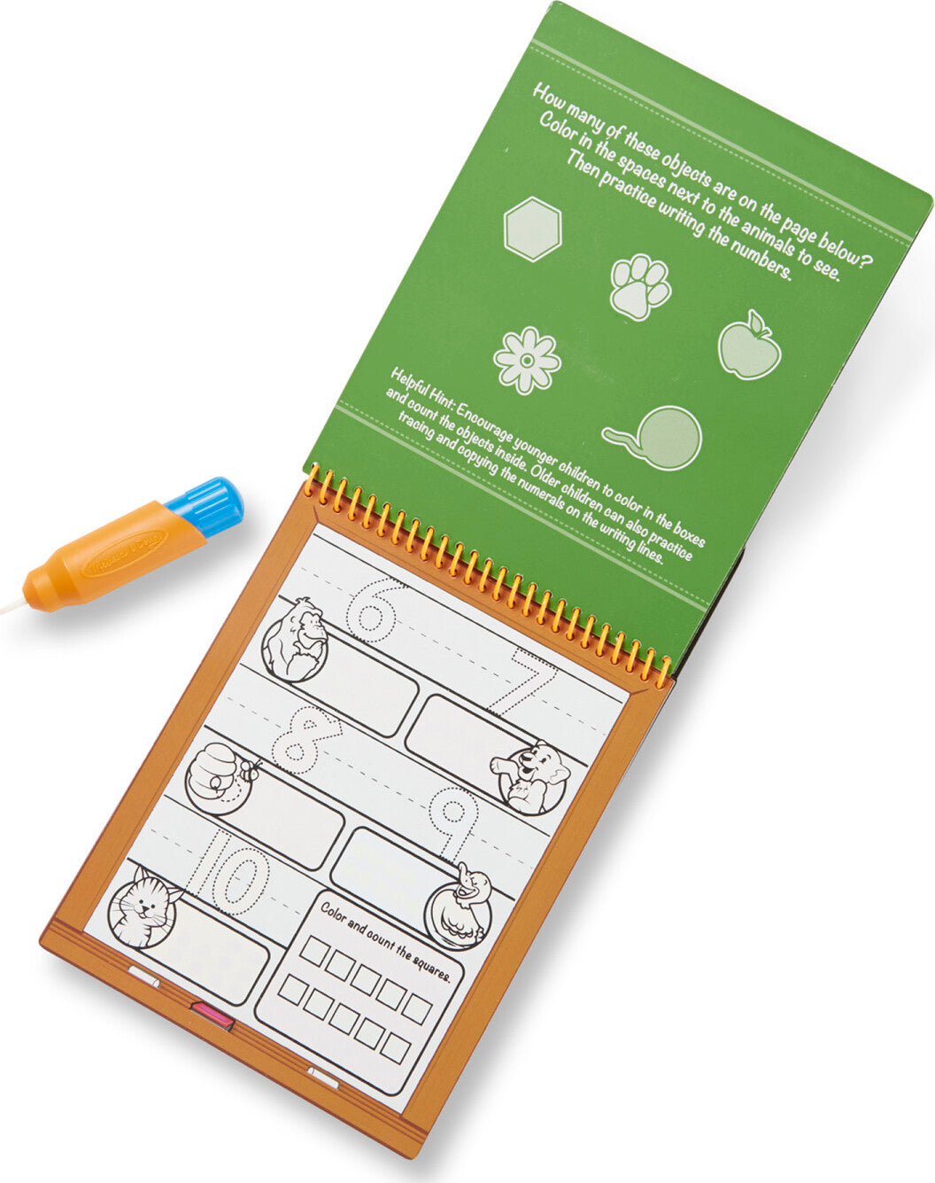 This exciting activity book includes four reusable pages and a refillable water pen. Use the pen to fill in each activity, from coloring in counters to tracing numbers, and see hidden colors and pictures appear with every stroke! Then simply let the page dry to erase the pictures and fill it in again and again. This learn-to-count book includes numbers 1-20 to trace, alongside pictures of familiar objects to count. There are empty lines to practice writing the numerals, too! The chunky-sized water pen is easy for kids to hold and stores neatly right in the front cover.